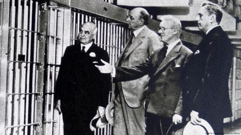 官员们参观了阿尔·卡彭的牢房,他可能是20世纪30年代阿尔卡特拉兹最臭名昭著的囚犯