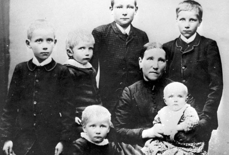 希尔一家。这幅肖像画描绘的是乔·希尔(Joe Hill)一家,他本名乔尔·哈格伦(Joel Hägglund),约 1890 年。他的母亲凯瑟琳娜·哈格伦(Catharina Hägglund)被孩子们围着。乔尔站在左边。乔尔右边是他的兄弟鲁本(Ruben)、埃弗拉伊姆(Efraim)和保罗(Paul)。他的妹妹埃斯特(Ester)坐在母亲的腿上,朱迪特(Judit)坐在卡塔琳娜旁边。