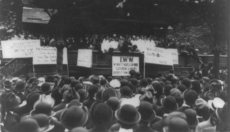 1913 年 5 月 17 日,世界产业工人联合会著名组织者约瑟夫·埃托在纽约市向一群罢工的理发师发表讲话。照片由国会图书馆提供。