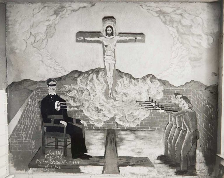 乔·希尔故居的壁画,这幅描绘处决乔-希尔的壁画位于乔-希尔招待所的一面墙上,该招待所是盐湖城的一个无家可归者收容所,在 20 世纪 60 和 70 年代由一位名叫阿蒙-亨纳西的社会活动家经营。