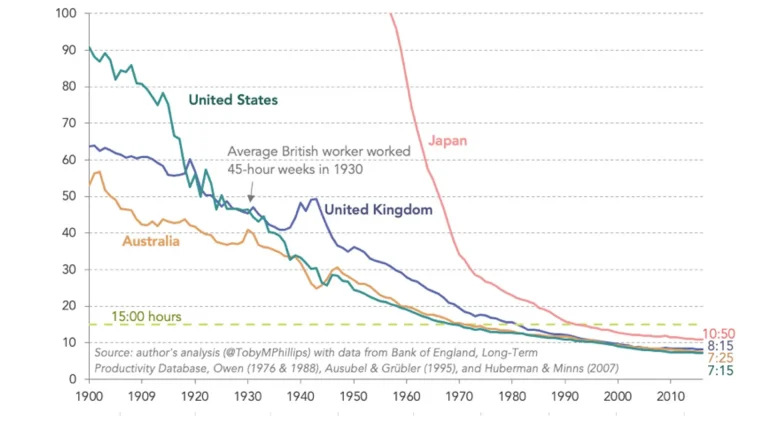 930 年,在大萧条发生一年后,约翰-梅纳德-凯恩斯坐下来撰写他的子孙的经济可能性。尽管全球经济秩序陷入低谷,人们普遍感到悲观,但这位英国经济学家仍然保持乐观,他说:”普遍的世界萧条……使我们看不到表面之下发生的事情”。他在文章中预测,100 年后,即 2030 年,社会将发展到我们几乎不需要工作的程度。英国和美国等国家面临的主要问题将是无聊,人们可能需要以’三小时轮班制或每周 15 小时制’来分配工作,以缓解这一问题”。乍一看,凯恩斯对未来的预测似乎很糟糕。1930 年,美国、英国、澳大利亚和日本的工人平均工作时间为 45 到 48 小时。如今,这一数字仍然高达 38 小时左右。