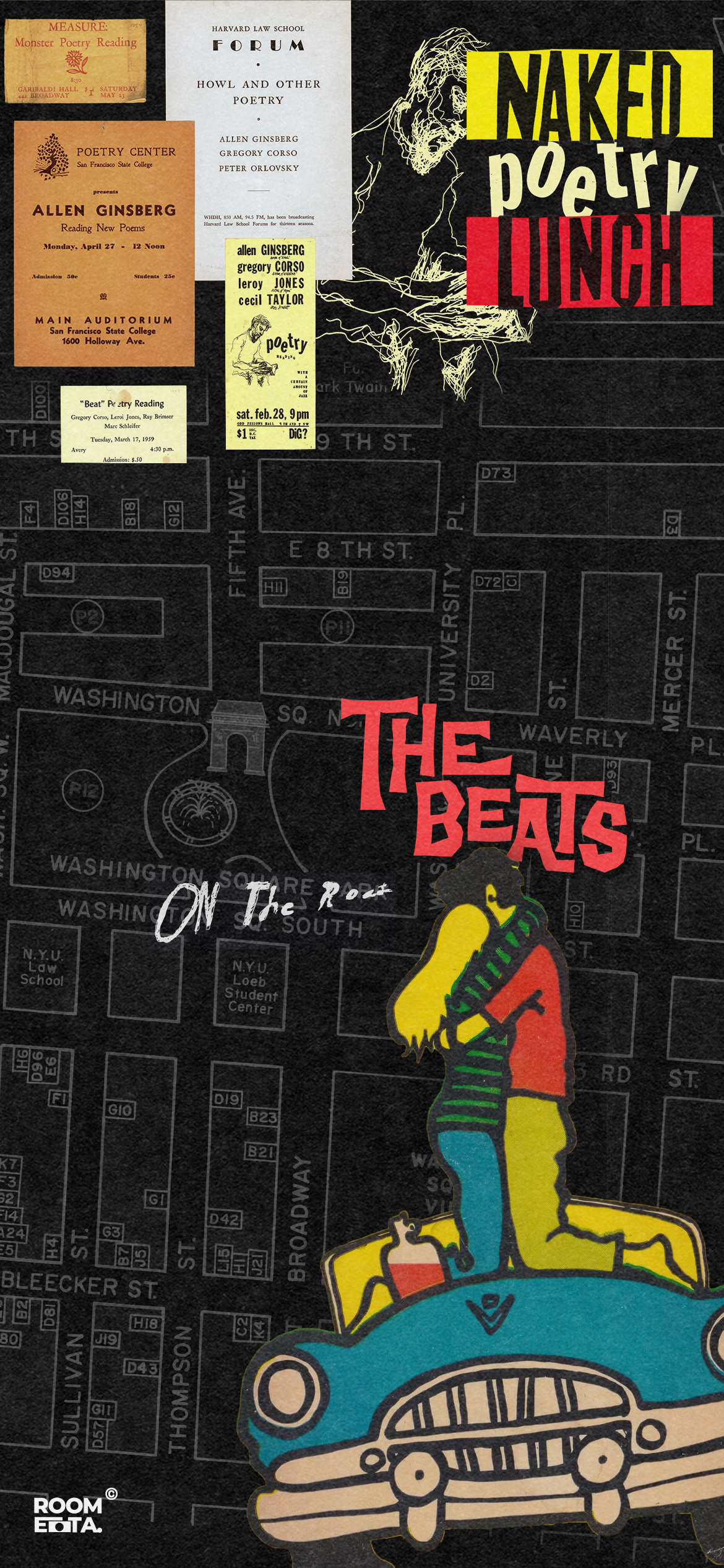 本图刊登在《物质财富:挖掘艾伦·金斯伯格的个人档案》(Material Wealth: Mining The Personal Archive Of Allen Ginsberg)本图为第 68-69 页:20 世纪 50-60 年代的各类海报。这本书包含了金斯伯格的知识、历史和文学财富,它以视觉注释的形式,收集了未发表的文件、图形、照片和零碎物品,记录了一位叛逆诗人、开阔灵魂、好奇的智识旅行者和不懈追求写作、艺术、音乐及文化的精神探索者的生活经历。