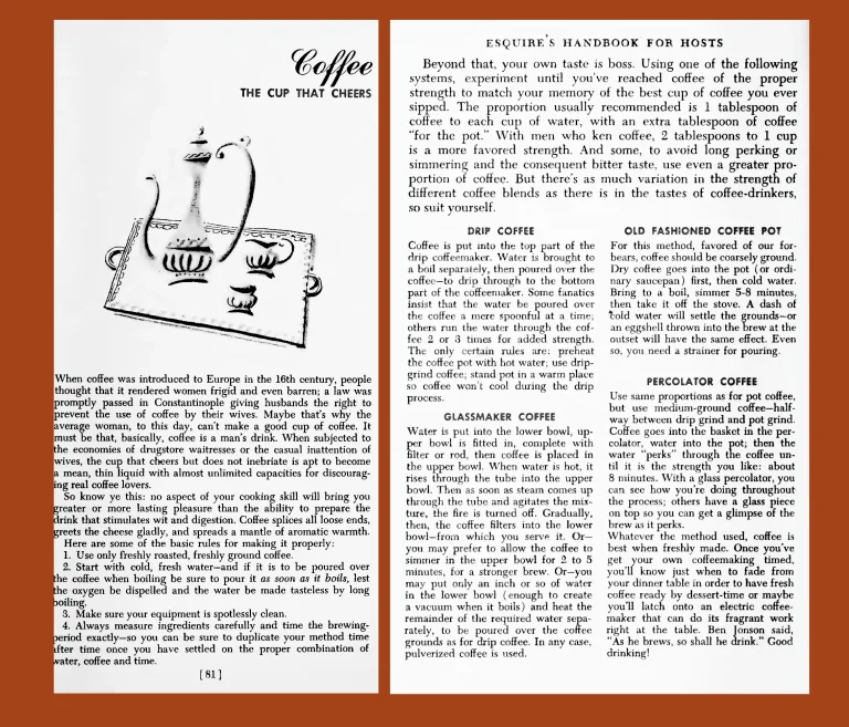 本 《Esquire》咖啡艺术指南出自《Esquire》杂志《主人手册:完美派对的经典指南 》( 公共图书馆 )中名为 “咖啡:令人愉悦的杯子” 的章节——这本书是 1949 年那个时代性别刻板印象的缩影。这本杂志的宗旨当然是向男性推销他们的男子气概,并缓解他们在掌握烹饪和娱乐等家庭事务方面的性别角色差异,因此毫不掩饰地将其描绘成一种纯粹的男人艺术。不妨一试,开怀大笑。