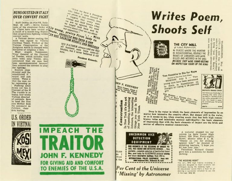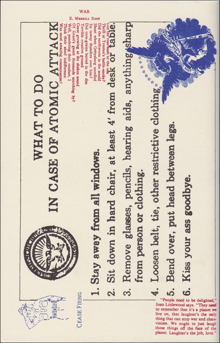 乔纳斯·梅卡斯(Jonas Mekas)提交了叶夫根尼·叶夫图申科(Yevgeny Yevtushenko)在《明镜周刊》(Der Spiegel)发表的一首诗;肯·雅各布斯(Ken Jacobs)提供了关于荒谬、无感报道的剪报拼贴。其他来源材料——来自《耶鲁校刊》(Yale Record)的一幅厌女漫画,《纽约时报》关于越南儿童战争伤害的更正,抗反装扮电击疗法的喜讯——也被毫无遮掩地呈现,其荒诞与残酷被凸显无遗。